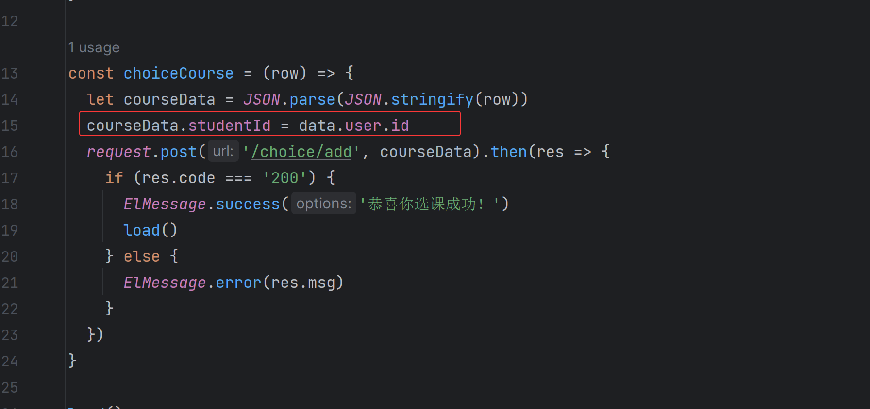 学生在进行选课操作时,前端封装了学生的ID,如图所示: