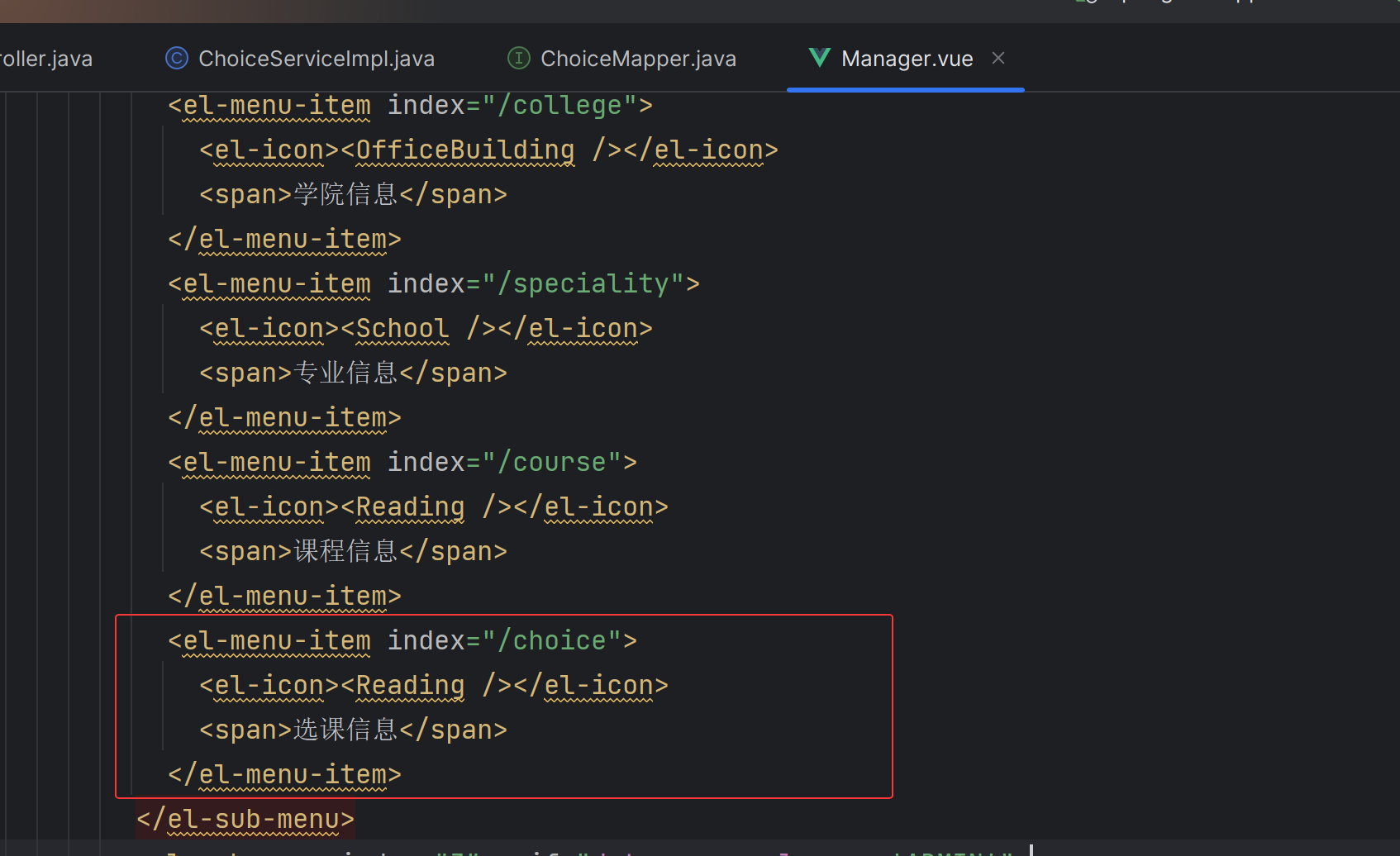 XML <el-menu-item index="/choice"> <el-icon><Reading /></el-icon> <span>选课信息</span> </el-menu-item>