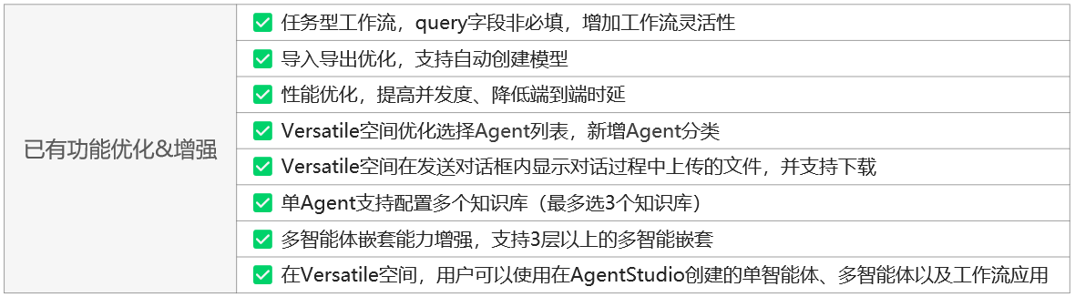 Versatile 920版本总结:新增27个特性,优化增强8个功能,新增多模态交互(图像、语音),新增敏感内容审查和风控,新增提示词管理,支持查看Trace调用链,查看使用量等统计指标,在运营运维、安全审查等企业级特性上有大幅提升。