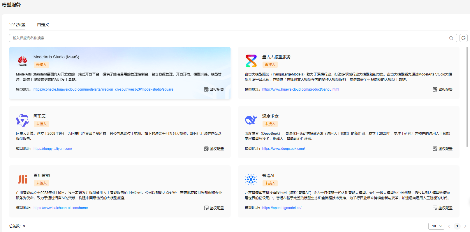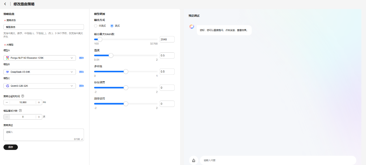 模型中心提供标准化API接口,支持盘古大模型与业界主流模型的接入与管理,提供多种路由策略,实现模型无感切换和灵活调度,支持NLP与多模态理解模型的在线调测及参数配置。