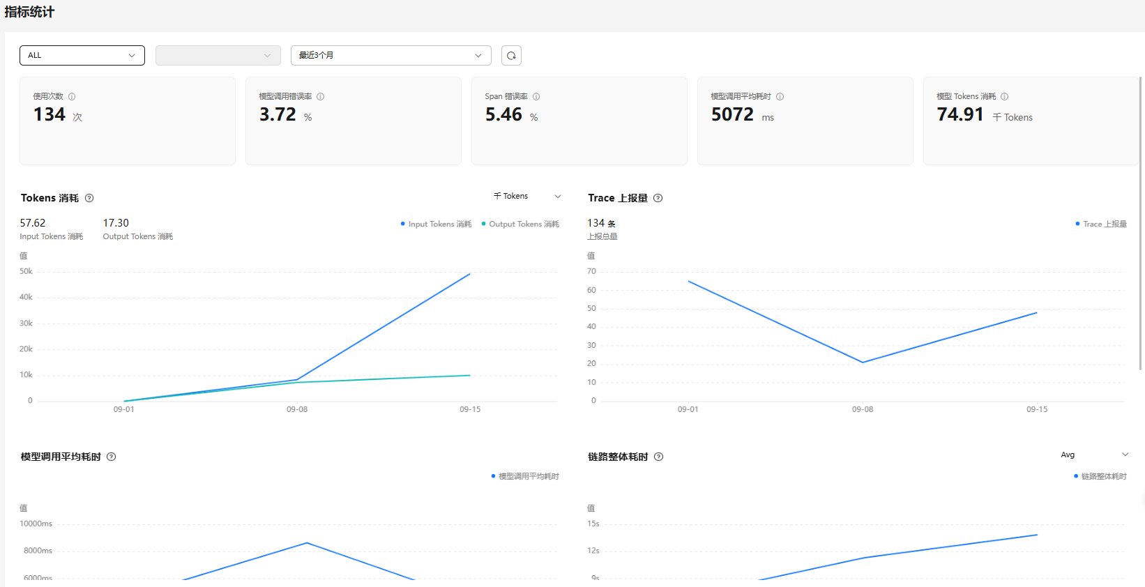 · 支持查看运营数据:支持查看智能体、工作流的各项运营指标统计:基础指标功能(使用次数、服务QPS、模型QPS等)、质量统计指标功能(模型调用错误率、调用错误率、模型调用平均耗时、链路整体耗时、服务请求成功率等)、成本指标功能(tokens消耗等)