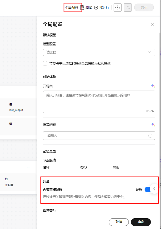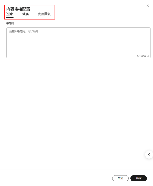 · 支持配置敏感内容审查和风控:支持配置敏感词,触发后可以进行过滤、替换以及设置兜底回复,确保输出合规。