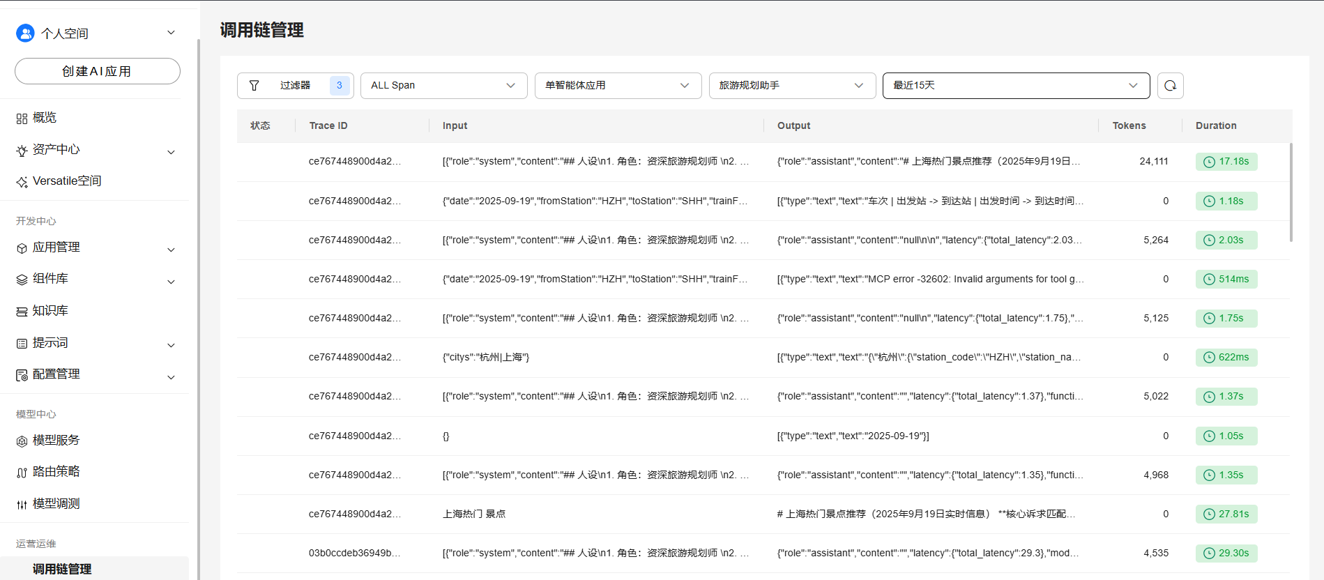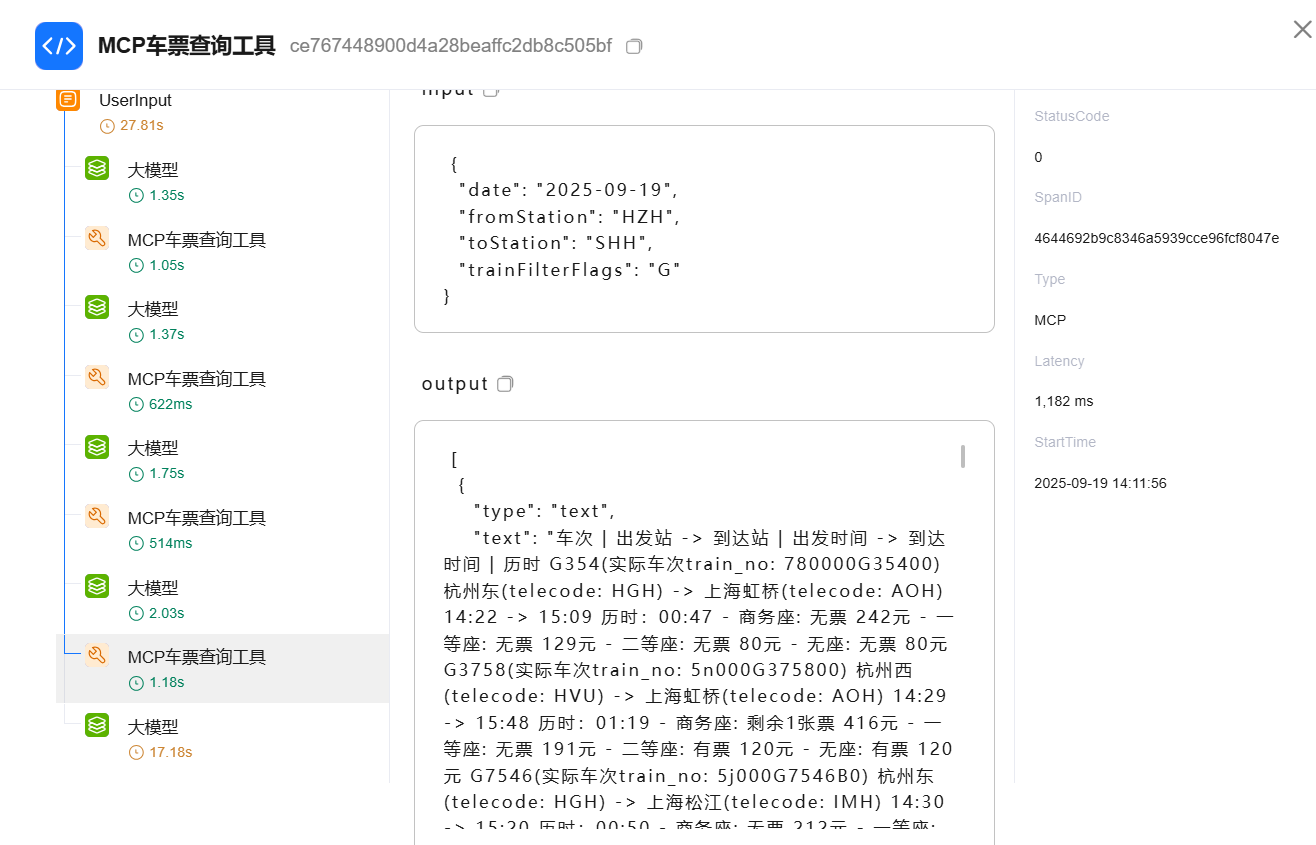 · 支持Trace调用链统计: 支持查看智能体、工作流的调用情况(时间、tokens消耗、input,output)