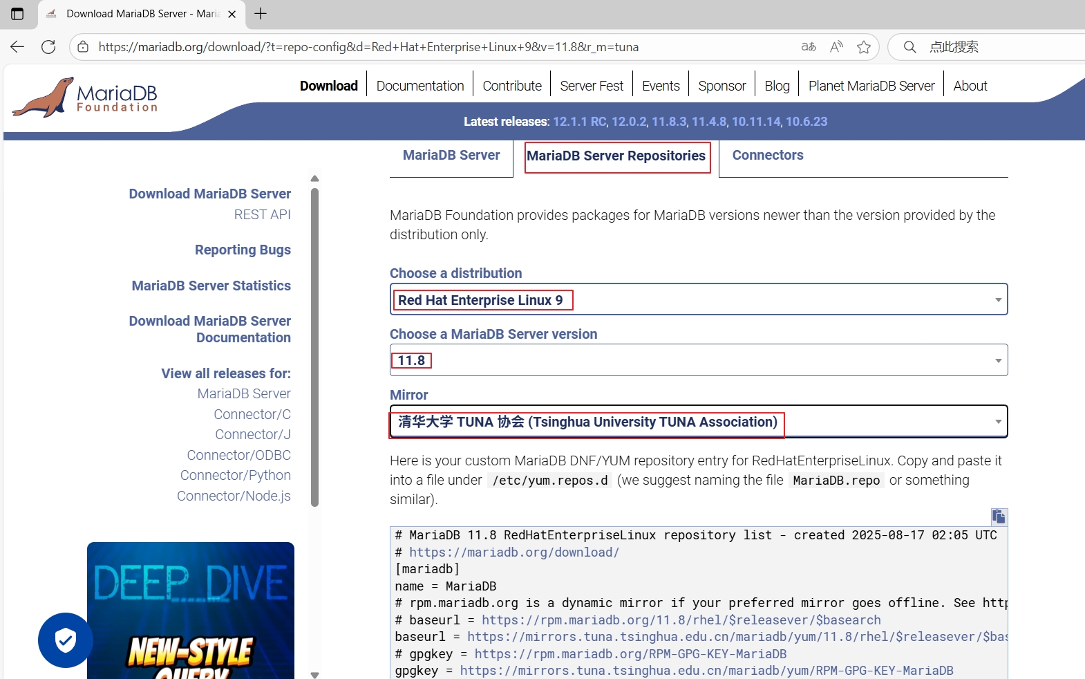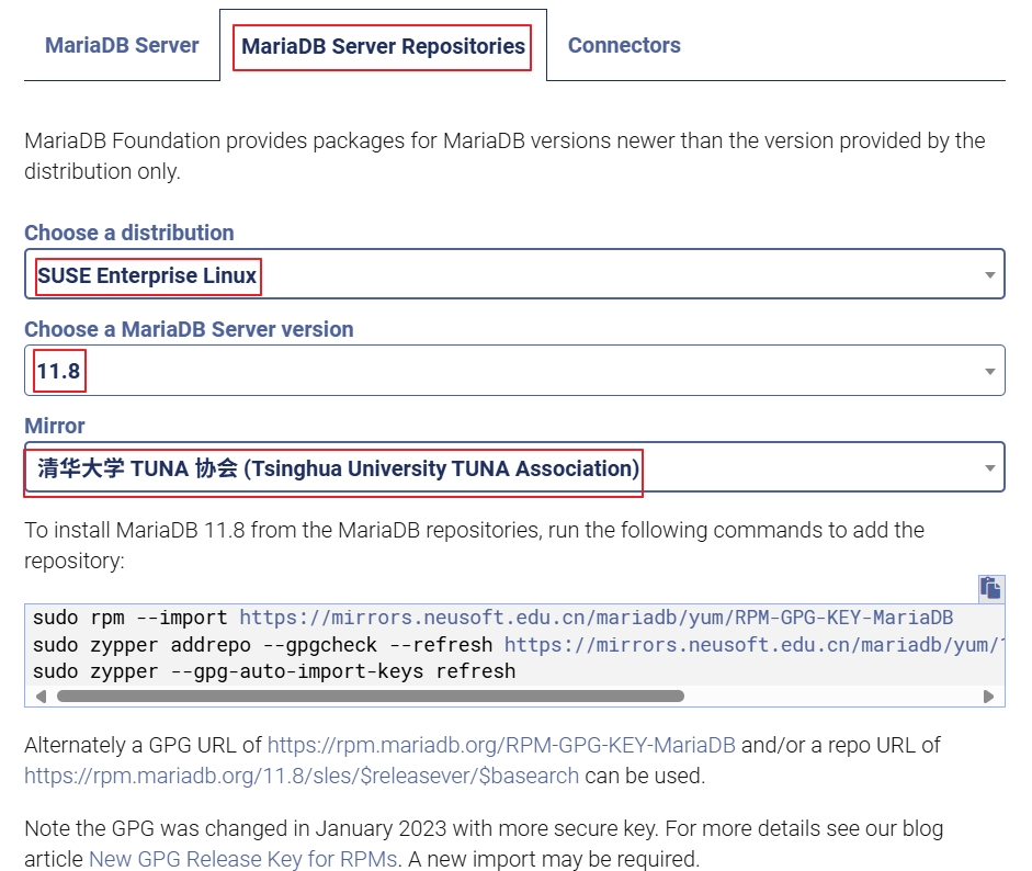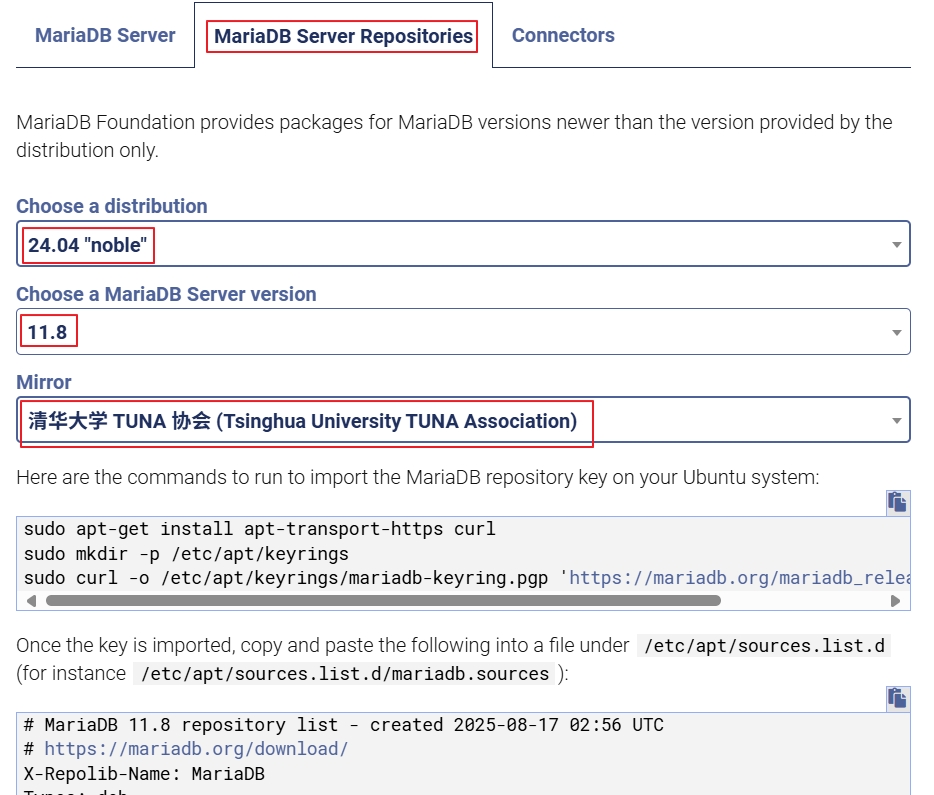 在打开的网页,在“MariaDB Server Repositories”下面选择“Choose a distribution为:24.04 “noble””,选择“Choose a MariaDB Server version为:11.8”,选择“Mirror为:清华大学 TUNA 协会 (Tsinghua University TUNA Association)”,然后根据下面提示操作。