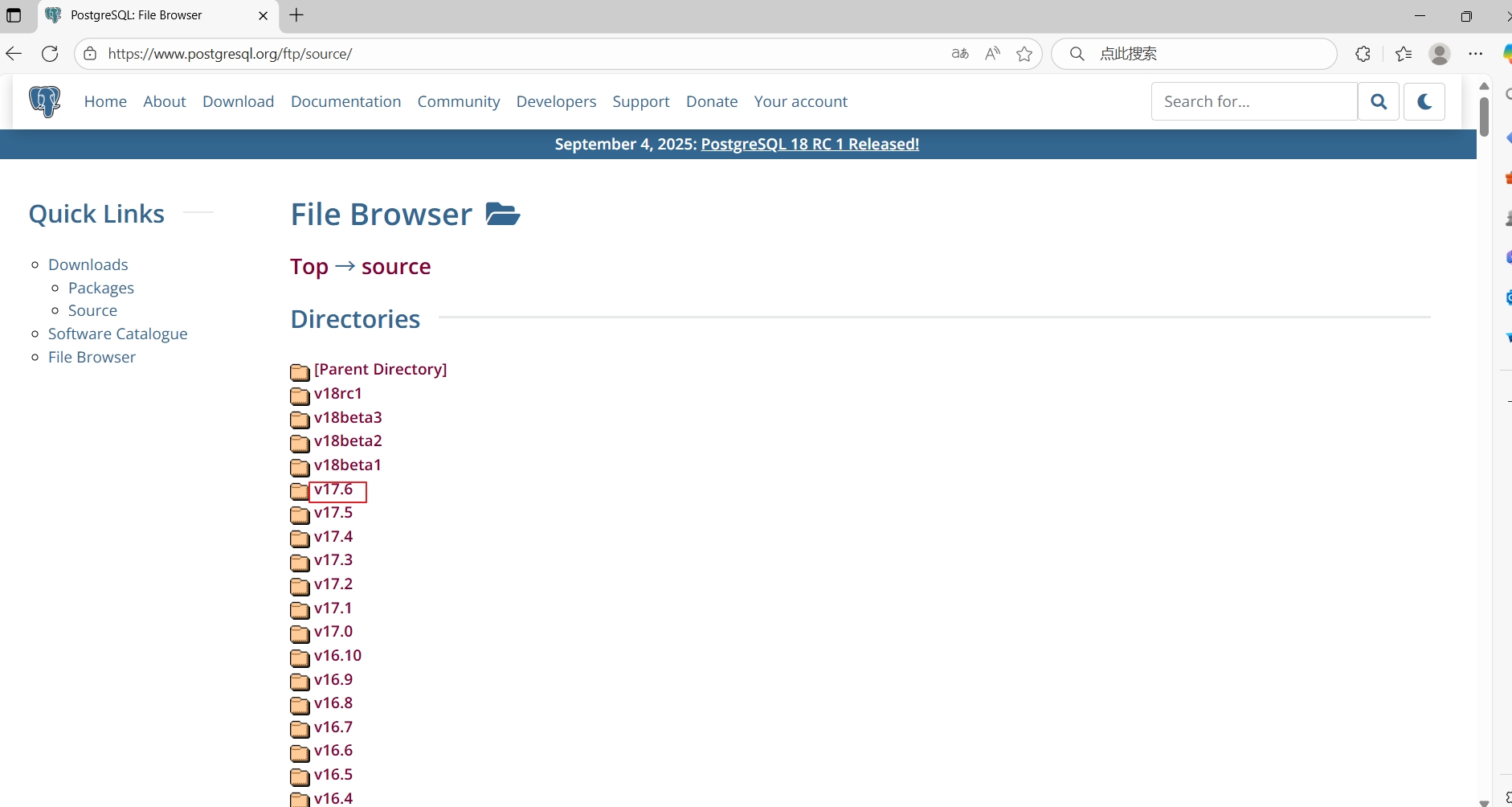 PostgreSQL源码包下载,去“https://www.postgresql.org/ftp/source”网站下载,根据需要的版本下载,比如这里下载:v17.6。