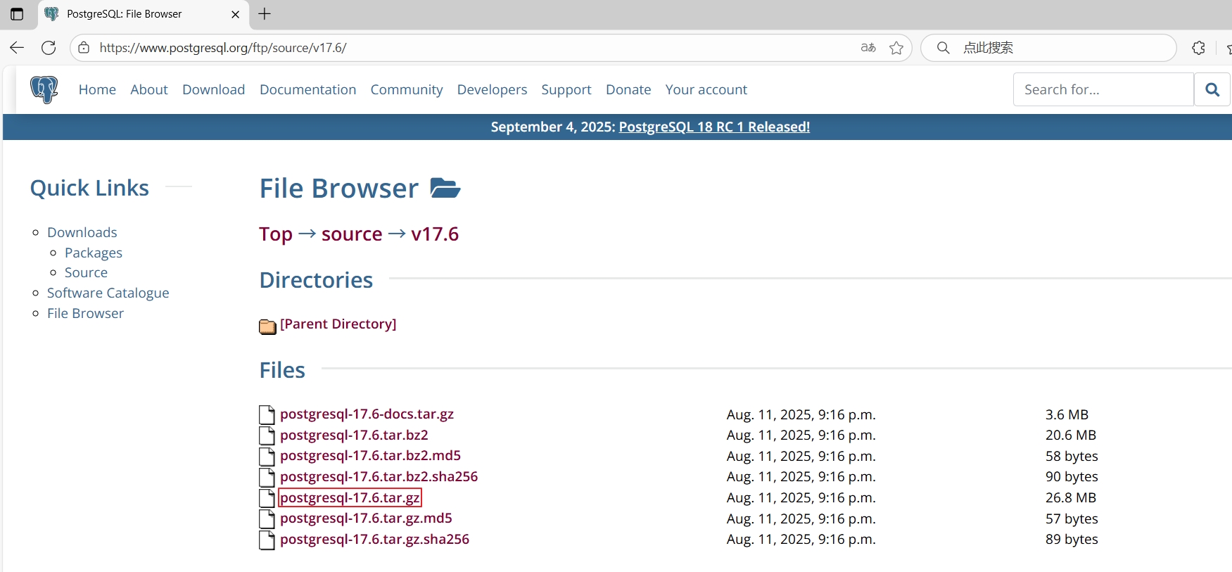 然后下载源码包“postgresql-17.6.tar.gz”。