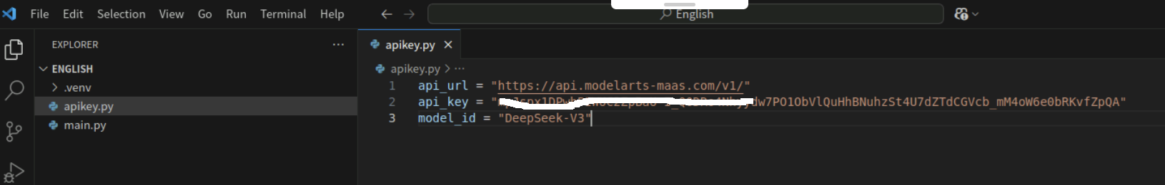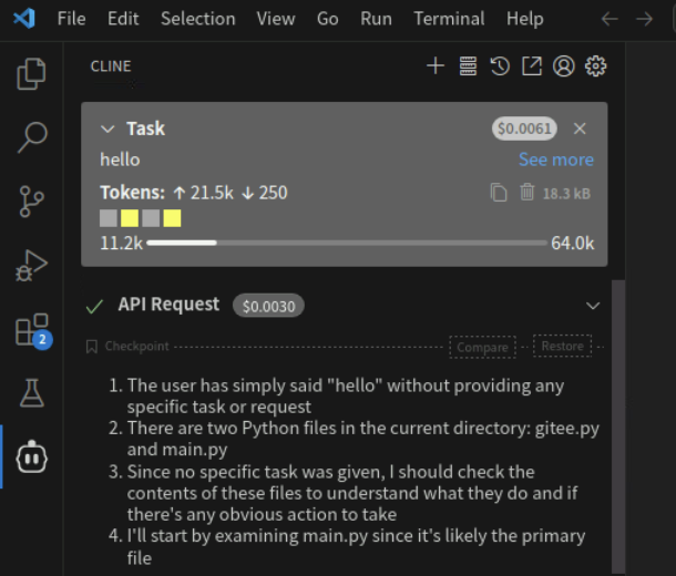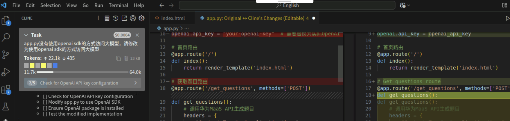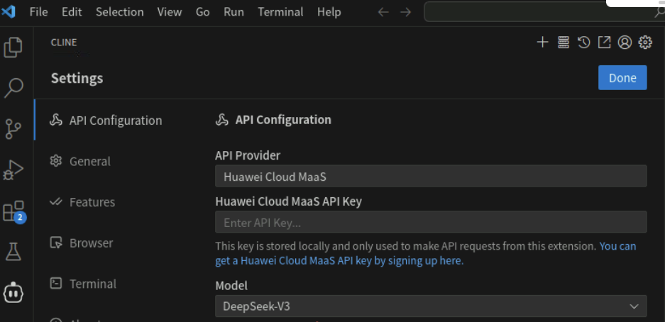 第二步,AI编程助手准备,这里推荐使用开源的cline,功能很强大,只是token消耗的很快,但在开发者空间欢迎页权益中心里,每周可以领200w deepseek v3的商业级token,所以也不用担心了。在vs code里安装cline插件后,用从空间领取的token key参数配置进去,就可以顺畅使用AI编程了,相比cursor等收费工具,这个AI编程工具完全免费。huawei maas key填入后,先向cline发个hello,有正确回应,就说明大模型的token api能正常工作了。然后手动在vs code里新建一个apikey.py文件,把大模型参数赋值进去,这样做的好处是让cline能自动感知大模型参数,后续能自动编程访问大模型api。