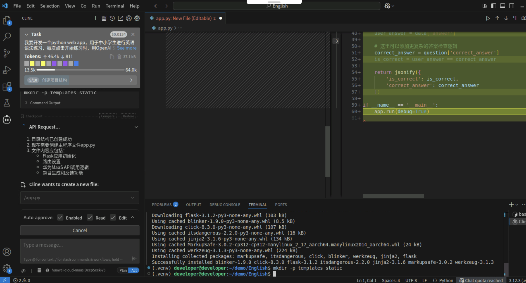 把这个需求复制到cline的输入框发送,可以看到它已经读取了apikey.py里的内容,知道后续该怎么向大模型获取语法练习题了。右侧编程区可以看到它已经在疯狂写代码了,写代码速度远超人类打键盘。