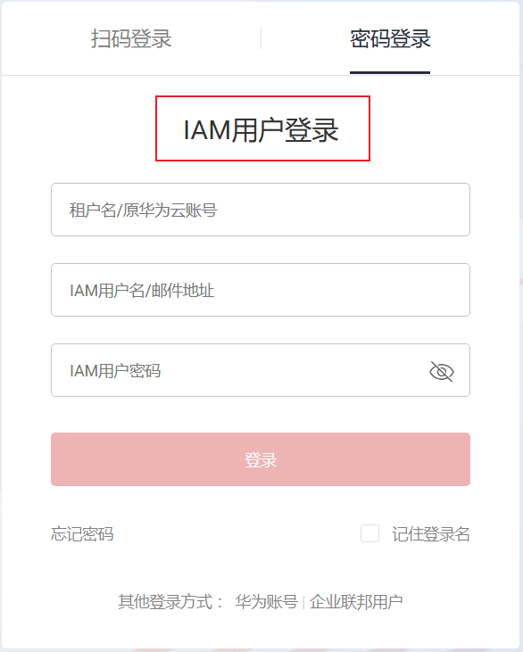 使用IAM用户登录,输入租户名、IAM用户名、IAM用户密码登录华为云官网