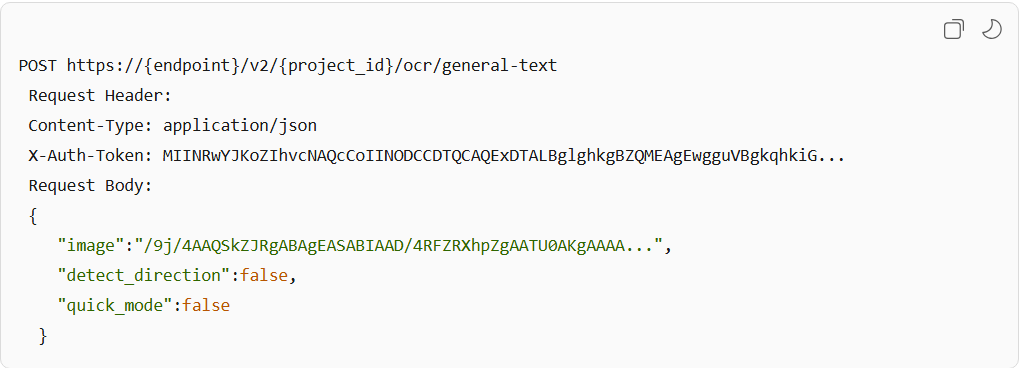 https://ocr.cn-north-4.myhuaweicloud.com/v2/{北京四项目ID}/ocr/general-text