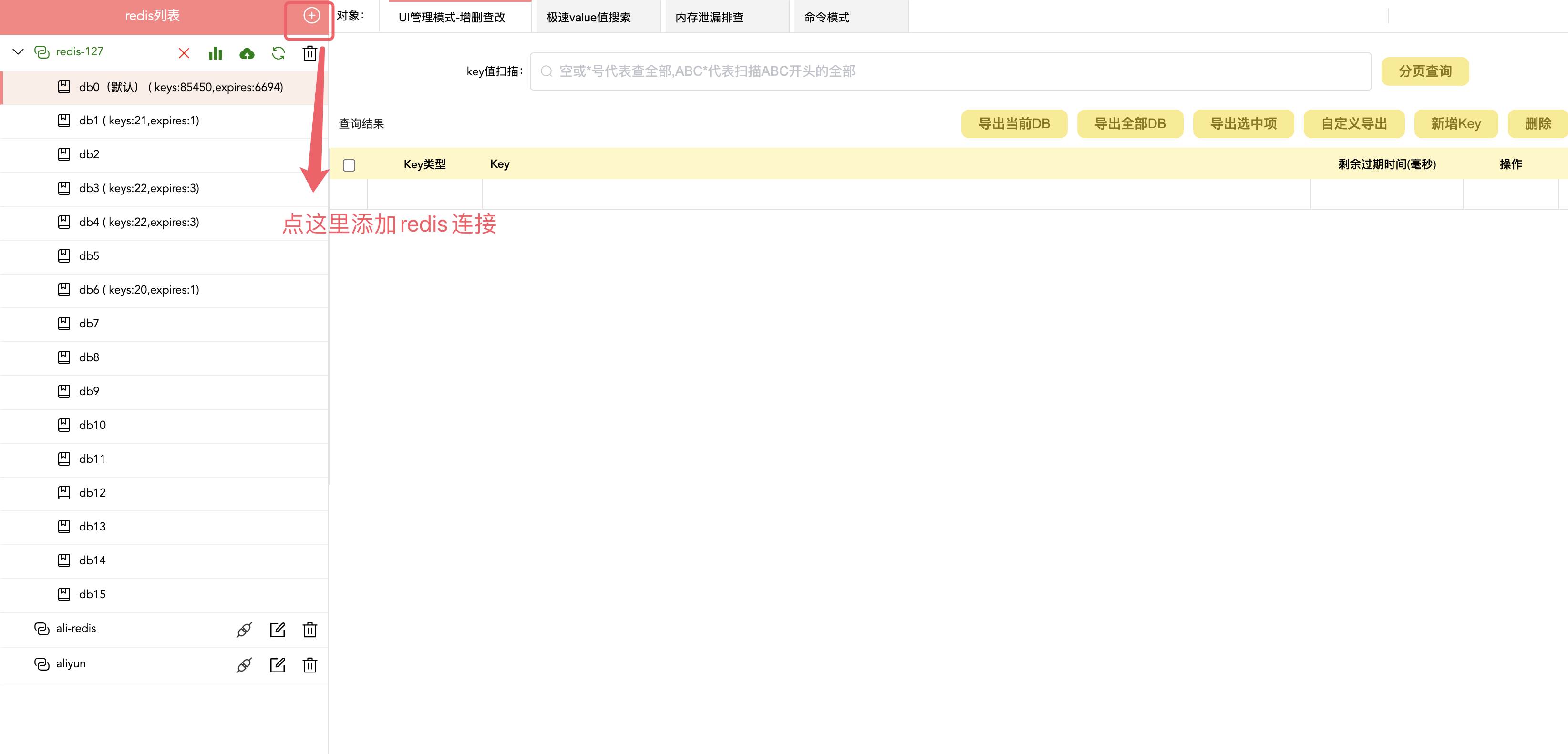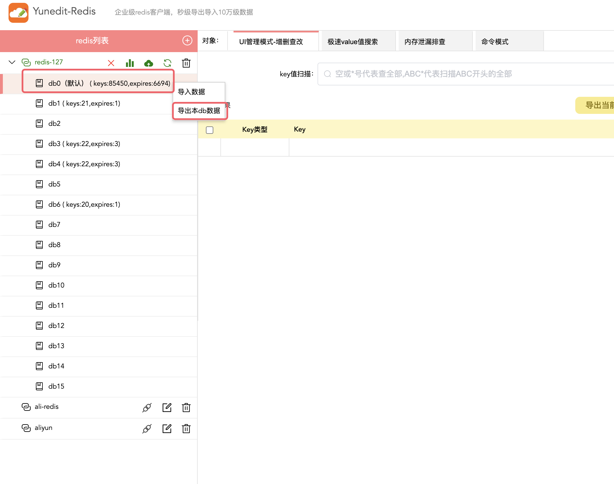 后面,我使用了客户端工具来做迁移,没想到导入和导出的效果这么高,几十万条数据,几分钟就完成了。我使用了yunedit-redis这个工具来做迁移。