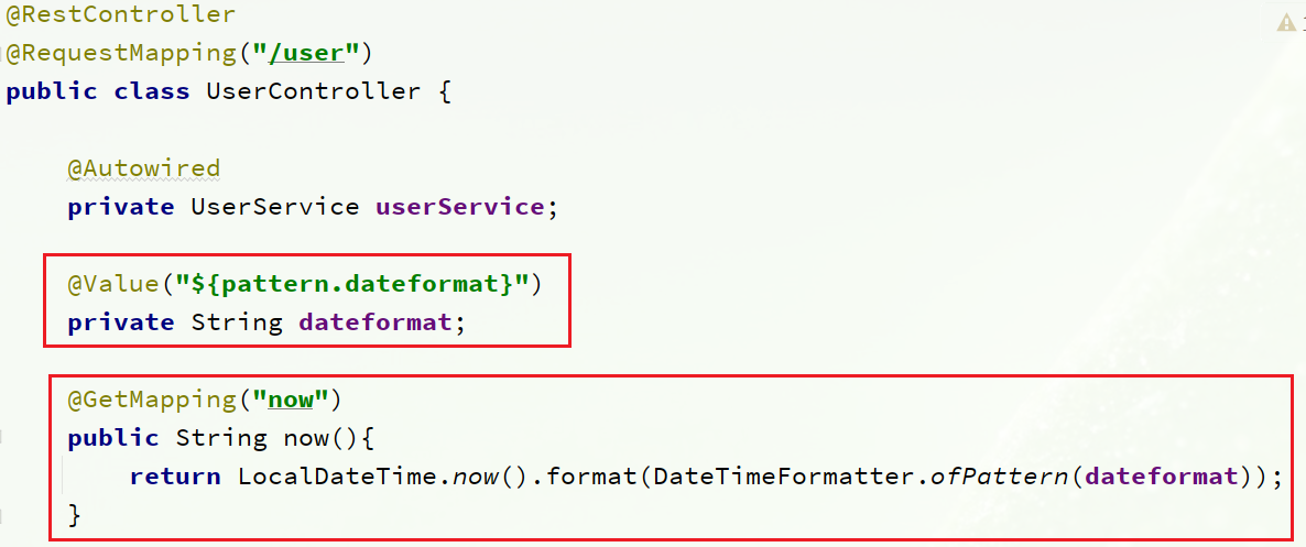 在user-service服务中,添加一个类,读取patterrn.dateformat属性: