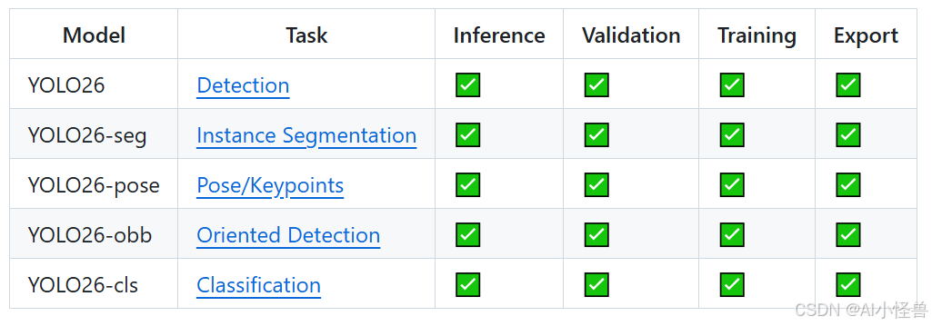 YOLO26延续了Ultralytics模型的多功能传统,支持广泛的计算机视觉任务:
