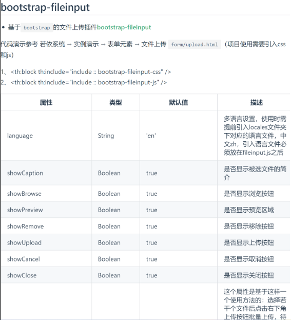 ruoyi的前端是依赖于fileinput来实现的,其官方的文档手册地址可以参见:bootstrap-fileinput。