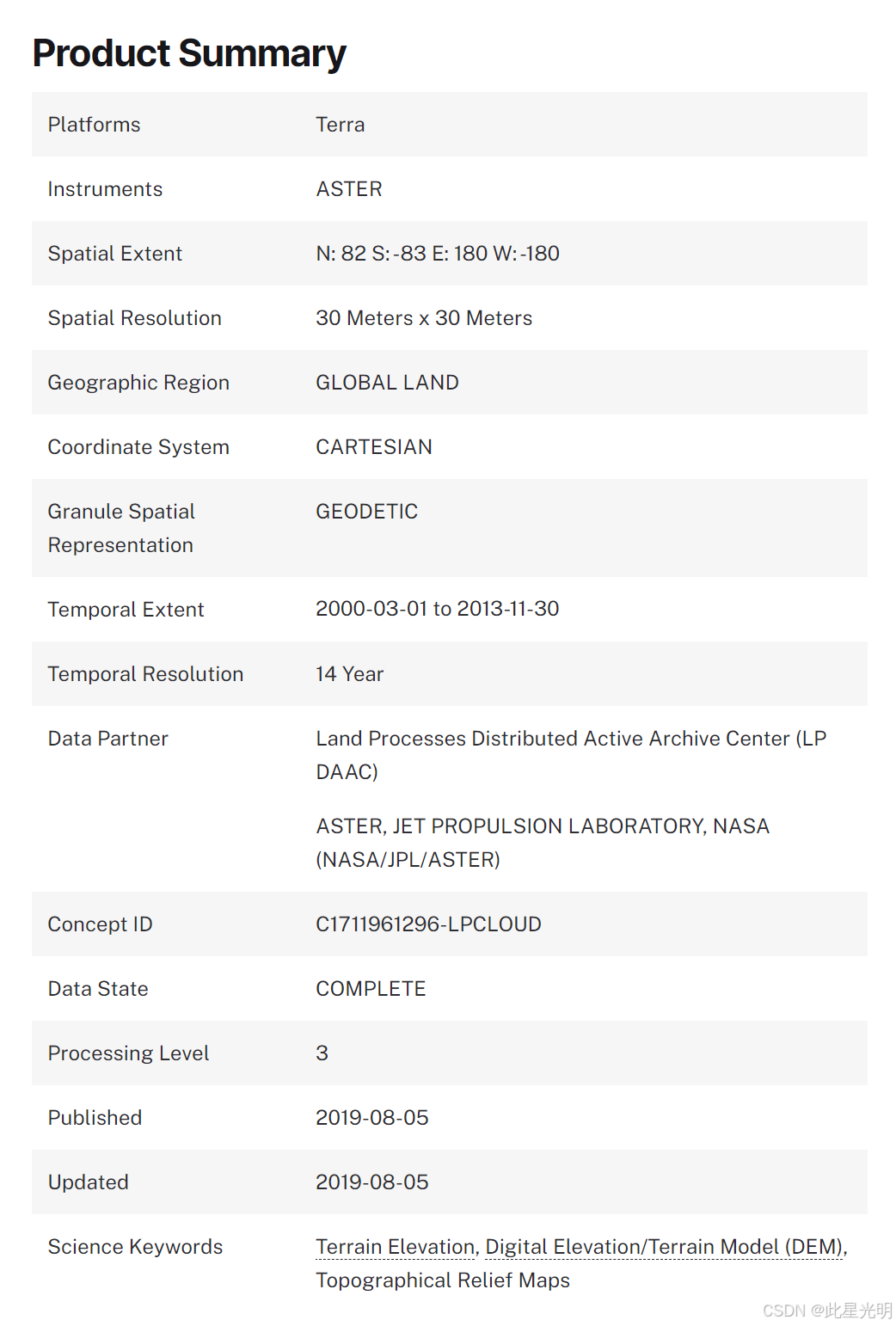 提醒用户,由于数据集中存在已知的误差和人为因素,请在使用产品时注意这些限制。数据按“原样”提供,NASA 和 METI/地球资源卫星数据分析中心 (ERSDAC) 均不对因使用该数据而造成的任何损害负责。