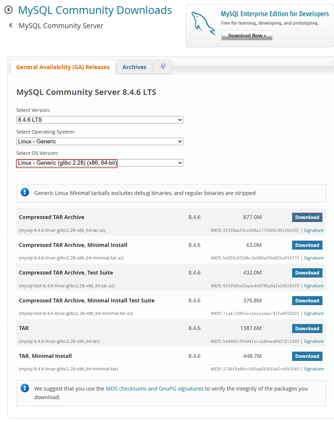 然后版本选择“8.4.6 LTS”,操作系统选择“Linux-Generic”,下面的有3个版本,分别是“glibc 2.28 (x86, 64-bit和ARM, 64-bit)、glibc 2.17 (x86, 64-bit)”,这个根据系统的glibc版本和主机的硬件架构类型下载,如图82所示。