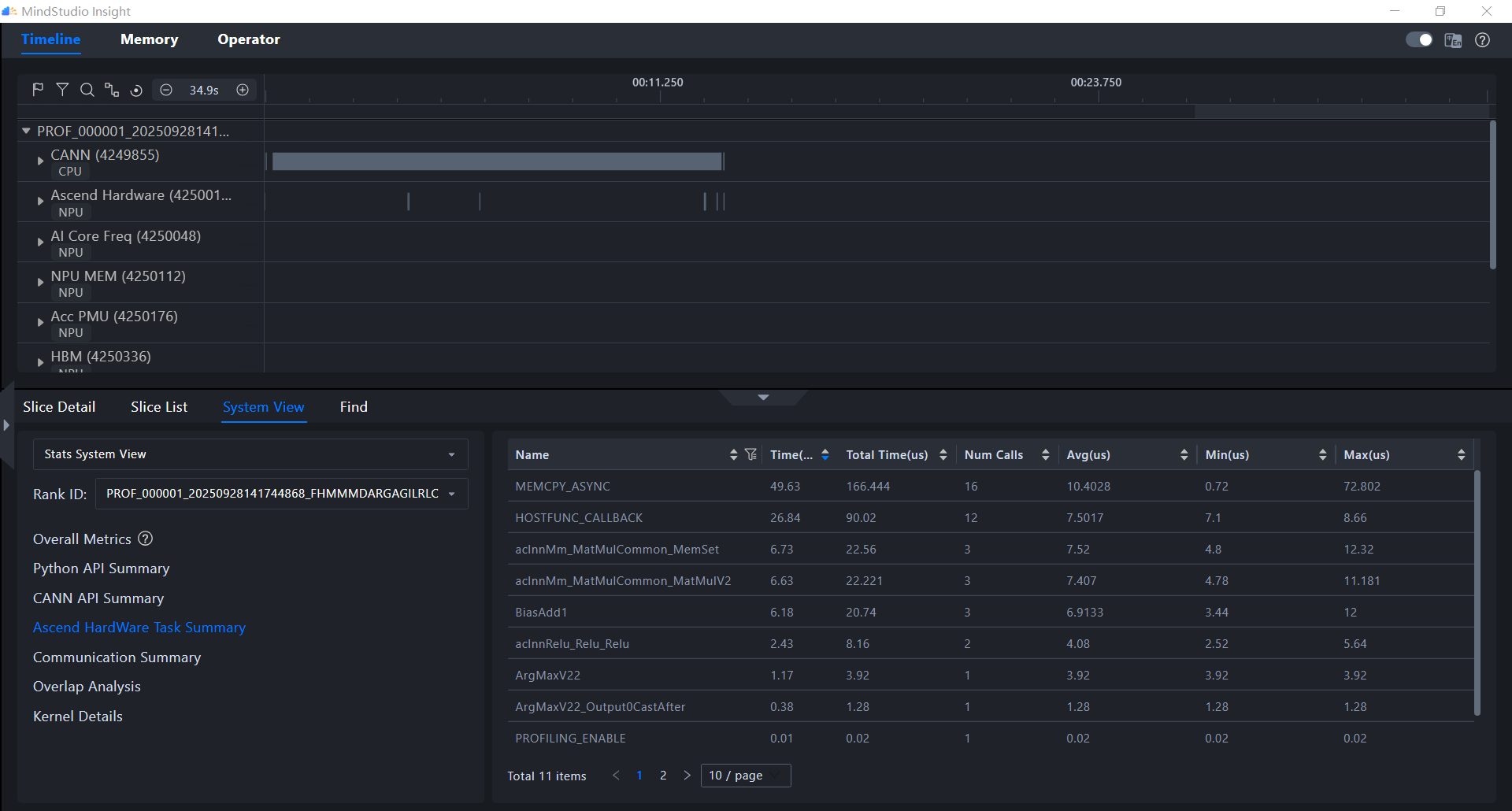 通常,分析流程是:先在 System Views 的汇总信息(如 Ascend Hardware Task Summary)中发现某类任务耗时异常,然后切换到 “算子”界面 ,对算子进行排序和筛选,从而定位到具体的性能瓶颈算子 。