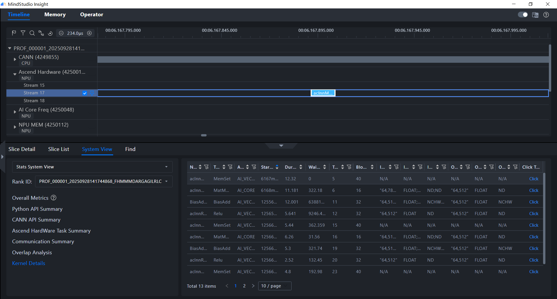 system views下面Ascend Hardware Task SummaryKernel Details ,它们虽然都涉及在 NPU 上执行的任务,但它们的统计维度和详细程度不同,服务于不同的分析目的 。