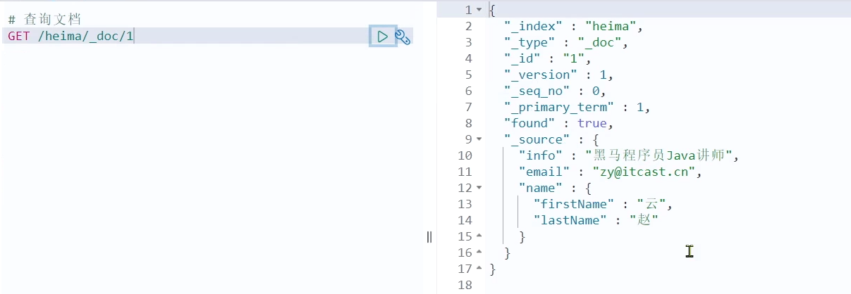 - 查询文档:GET /{索引库名}/_doc/文档id