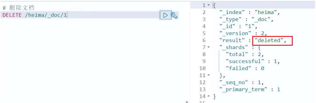- 删除文档:DELETE /{索引库名}/_doc/文档id