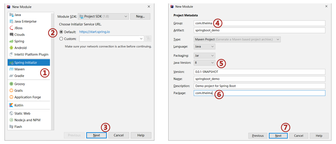 ①:创建新模块,选择Spring初始化,并配置模块相关基础信息