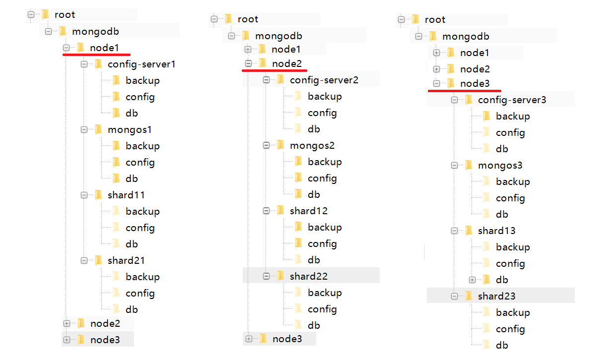 - 在root目录下创建mongodb目录。内部依次创建文件夹(node1,node2,node3)。