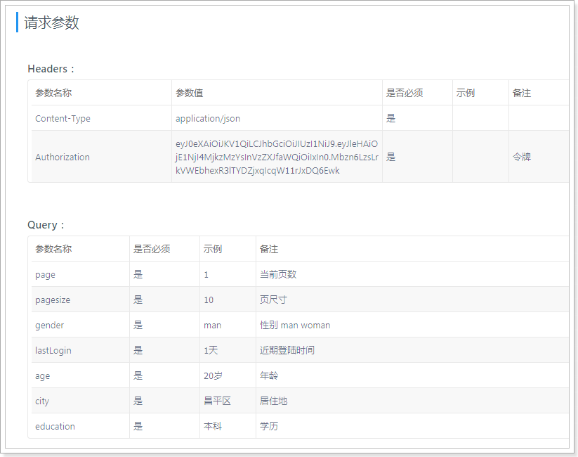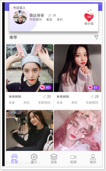 响应: ~~~json { "counts": 4698, "pagesize": 20, "pages": 58, "page": 16, "items": [ { "id": 1011, "avatar": "assets/images/avatar_2.png", "nickname": "黑马小妹", "gender": "woman", "age": 23, "tags": [ "本科", "年龄相仿", "单身" ], "fateValue": 96 }, {