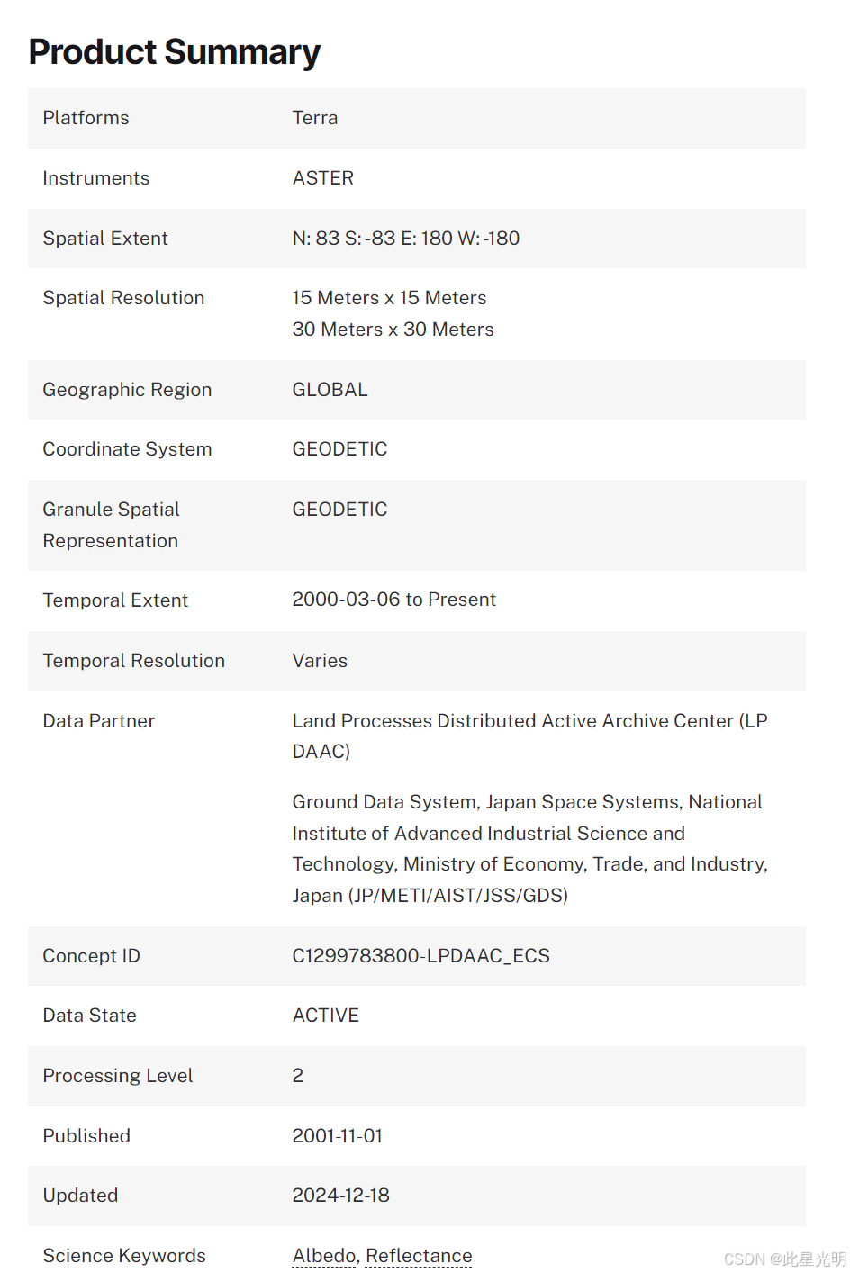 数据异常:请注意,从 2008 年 4 月至今采集的 ASTER SWIR 数据存在数值异常饱和和异常条纹。这种现象在之前的某些采集时期也存在。更多详情,请参阅 ASTER SWIR 用户咨询。