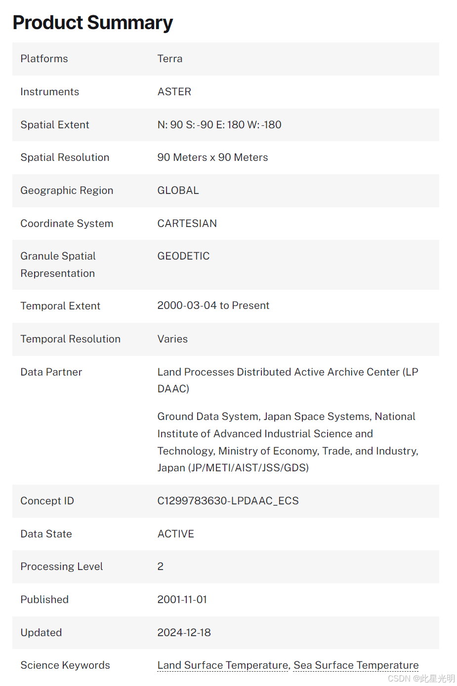 Terra 先进星载热辐射与反射辐射计 (ASTER) 地表动能温度 (AST_08) 数据利用光谱范围为 8 至 12 µm 的五个热红外 (TIR) 波段(白天或夜间均可获取)生成。它仅包含陆地区域 90 米空间分辨率的地表温度数据。地表动能温度数据为火山活动、热惯性、地表能量以及高分辨率火灾测绘研究提供了重要数据。