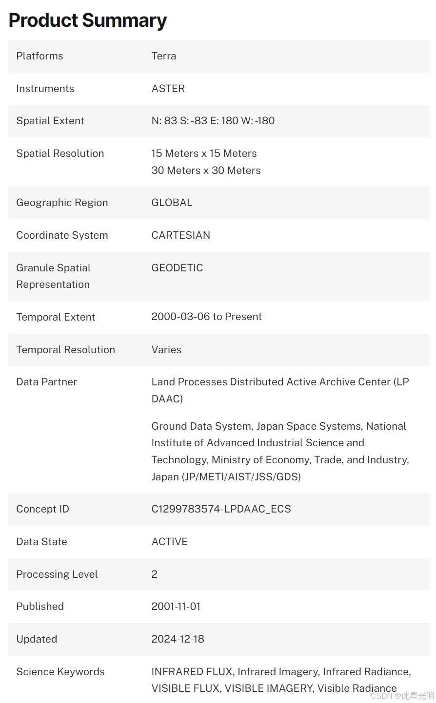 数据异常:请注意,从 2008 年 4 月至今采集的 ASTER SWIR 数据存在数值异常饱和和异常条纹。这种现象在之前的某些采集时期也存在。更多详情,请参阅 ASTER SWIR 用户咨询。