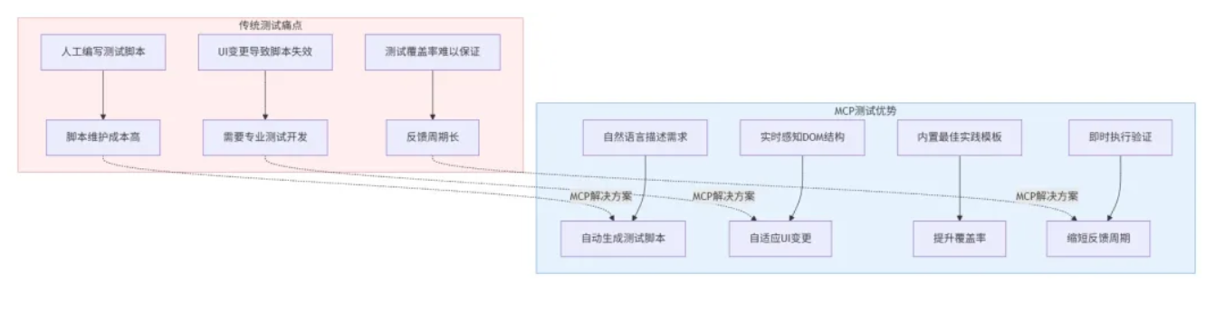 强大的自适应能力:当页面结构发生变化时,基于MCP的测试方案可以快速调整脚本,甚至绕过脚本直接使用Prompt完成测试,极大降低维护成本。 -
