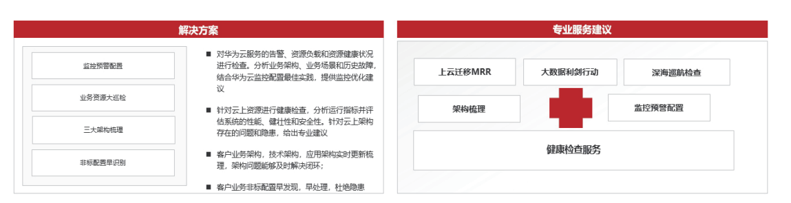 - 健康检查:基于华为云可用性检查五大维度,从性能效率、可靠性、可服务性、容量优化、安全性综合识别云上风险及非标配置;