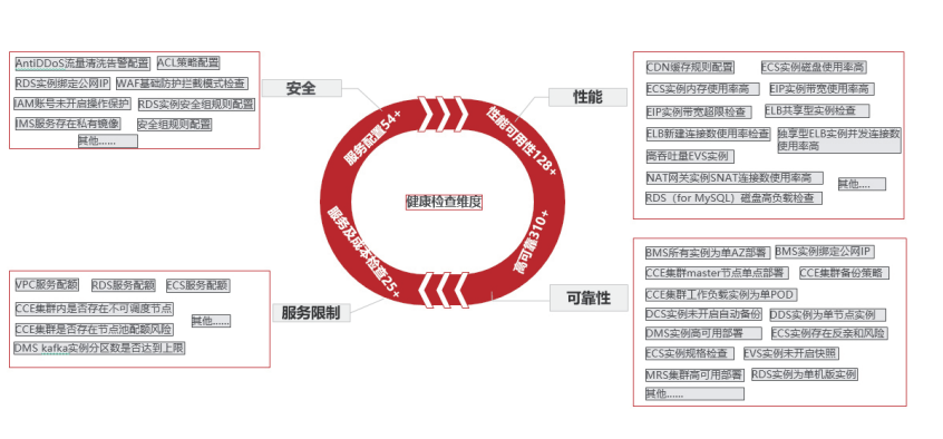 如图所示:安全维度检查涵盖企业敏感账户、安全配置组策略、WAF安全产品防护拦截模式等配置信息;性能维度包含各云服务规则配置、宽带、并发数、磁盘负载、CPU利用率等信息;可服务性以云服务配额、集群部署方式、节点池配额、消息中间件分区等为侧重点;可靠性偏重云上业务高可用部署方式、是否为敏感业务单节点部署、核心数据备份策略等。