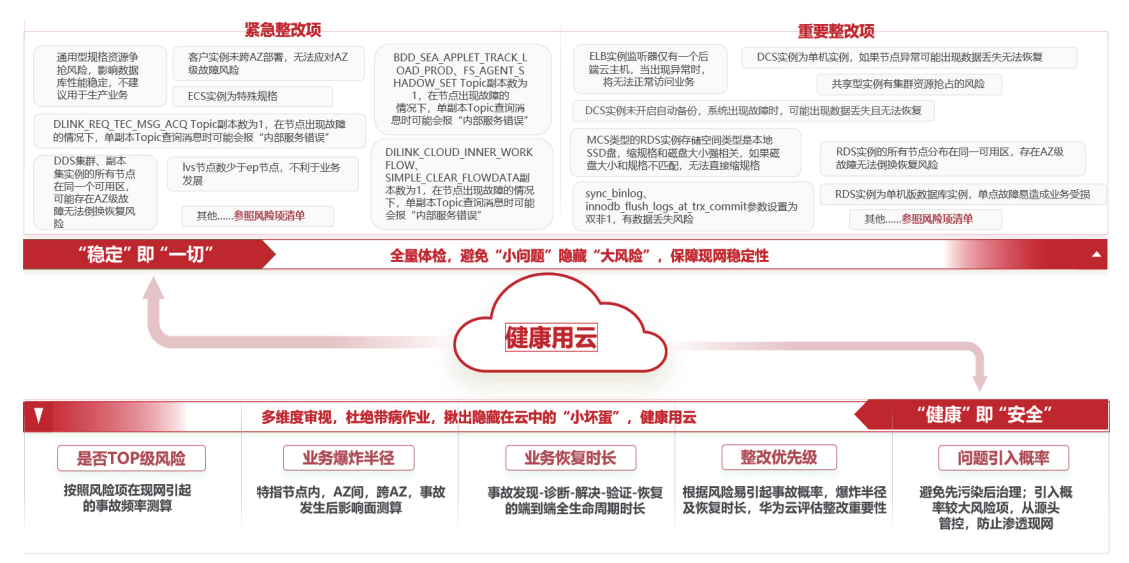 - 通过最佳用云实践对存量业务进行风险分析,针对盲点风险补齐运营短板,真正做到早识别、早处置,防患于未然。