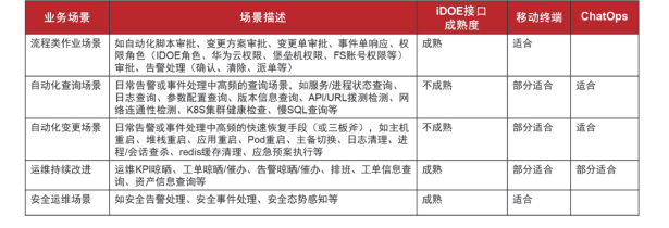 - 流程类作业场景:如自动化脚本审批、变更方案审批、变更单审批、事件单响应、权限角色(IDOE角色、华为云权限、堡垒机权限、FS账号权限等)审批、告警处理(确认、清除、派单等)。