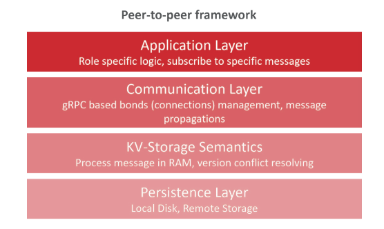 因此,HyperRouter 采用了点对点去中心化架构:各节点可独立完成状态发现与同步,即便部分区域发生网络分区,整个系统仍能维持核心功能正常运行。为此,我们从零构建了一套专为全局负载均衡设计的点对点框架,该框架由存储层、KV 语义层、通信层及应用层组成。这种架构的核心价值在于,即便出现网络分区,各"孤岛"节点仍能最大限度自主做出正确决策,从根本上避免了因依赖中心化组件而可能引发的级联故障。