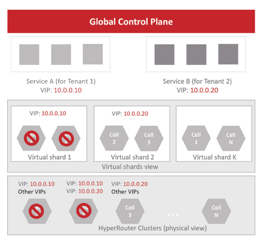 作为负载均衡服务,HyperRouter 无法依赖"Cell Router"实现 Cell 化,因此需由管控面直接负责 Cell 与虚拟分区的分配和管理。具体而言,通过将租户划分为多个 Cell 与虚拟分片,可将故障严格限制在较小范围内;而 Shuffle Sharding 的分片重叠设计,能进一步降低租户间的耦合概率,从而显著缩小故障爆炸半径。
