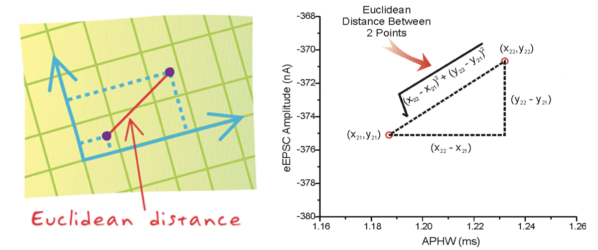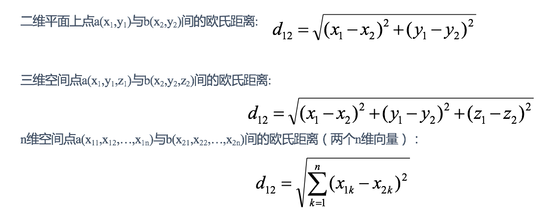 欧氏距离是最容易直观理解的距离度量方法, 小学、初中和高中接触到的两个点在空间中的距离一般都是指欧氏距离。