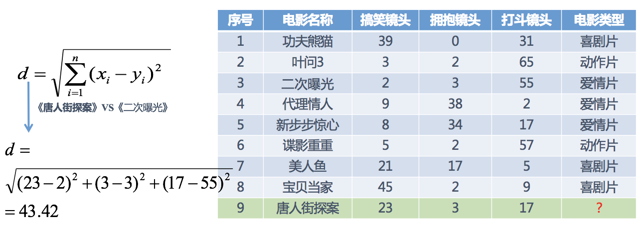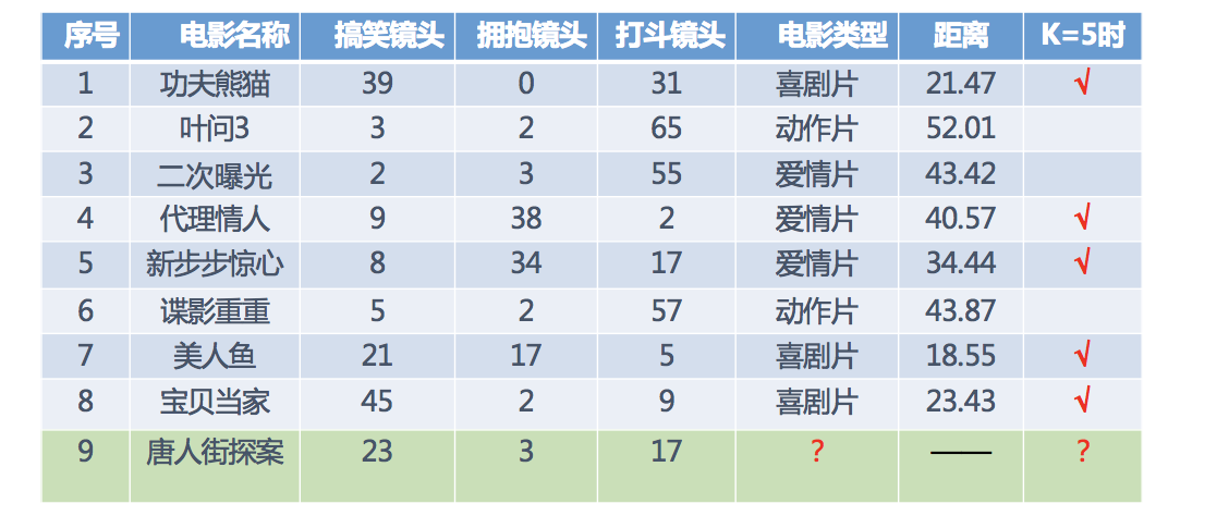 其中? 号电影不知道类别,如何去预测? 可以利用K近邻算法的思想