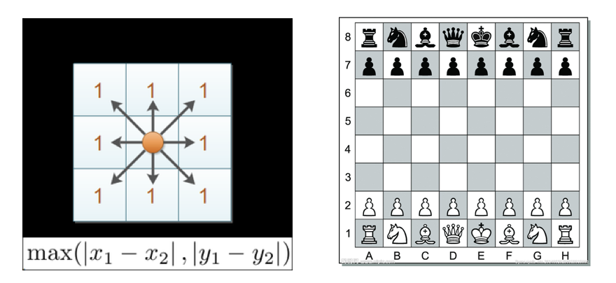 国际象棋中,国王可以直行、横行、斜行,所以国王走一步可以移动到相邻8个方格中的任意一个。国王从格子(x1,y1)走到格子(x2,y2)最少需要多少步?这个距离就叫切比雪夫距离。