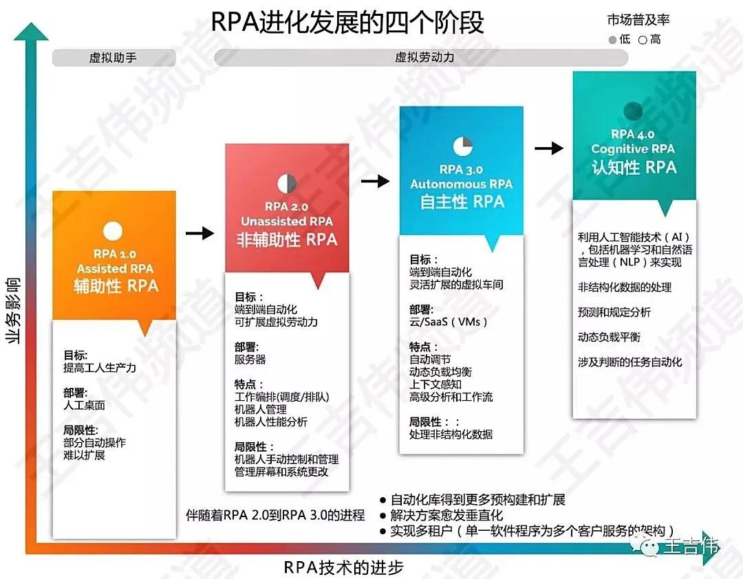 智能化为自动化赋能,智能是因,自动是果,企业对于稳定可靠自动化的需求,远大于对更先进的智能化技术的需求。企业应用流程自动化的进程,从企业对于RPA应用的阶段化发展可以体现,见下图。