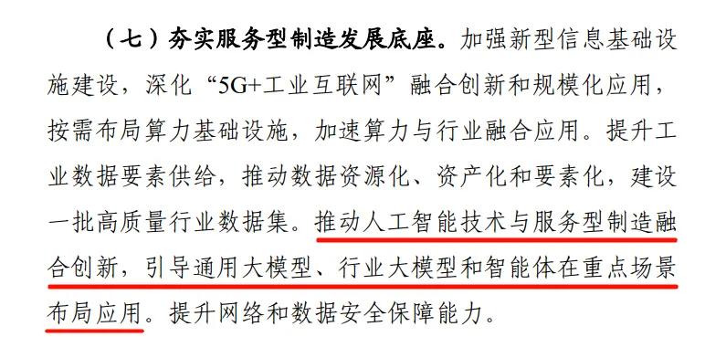 9月中旬,工信部等七部门联合印发了《深入推动服务型制造创新发展实施方案(2025—2028年)》政策文件。在“夯实服务型制造发展底座”的任务说明中明确提出,推动人工智能技术与服务型制造融合创新,引导通用大模型、行业大模型和智能体在重点场景布局应用。