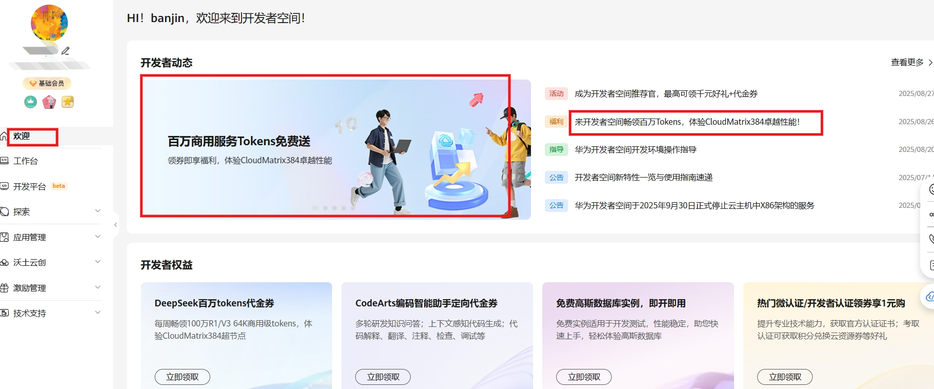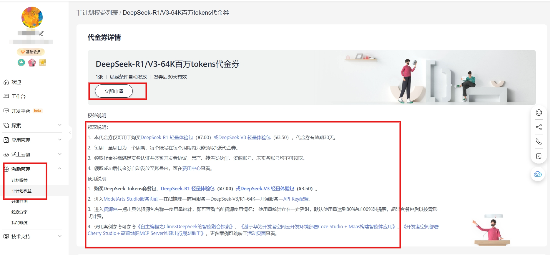 - DeepSeek-R1/V3-64K百万tokens代金券:https://developer.huaweicloud.cn/space/incentive/other-activity/deepseek-tokens/detail/A000038