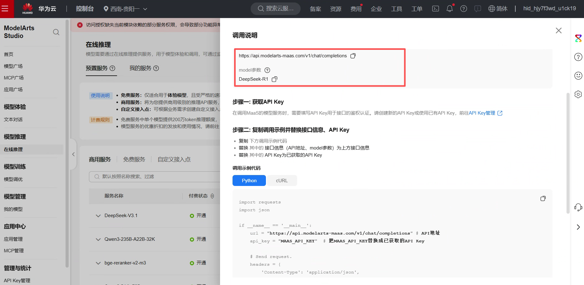 注意:这里一定要开通maas的商用服务,免费服务不可以