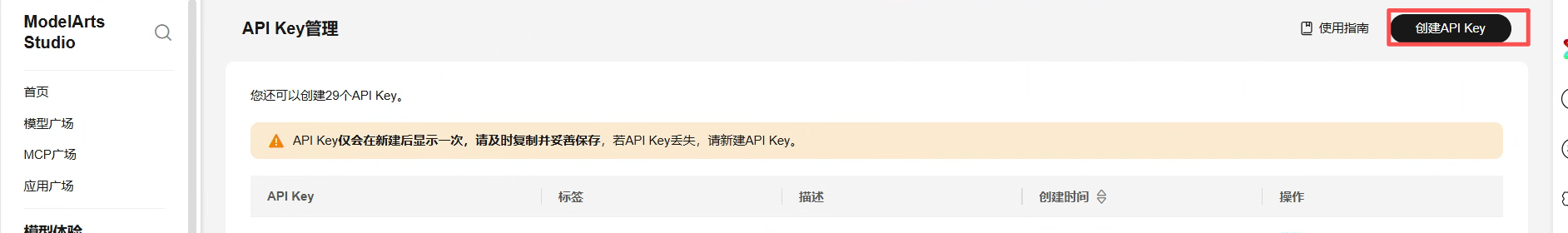 注意!!创建好API Key之后,点击后面的复制按钮,妥善保存,若未复制保存,后续无法重新复制获取。