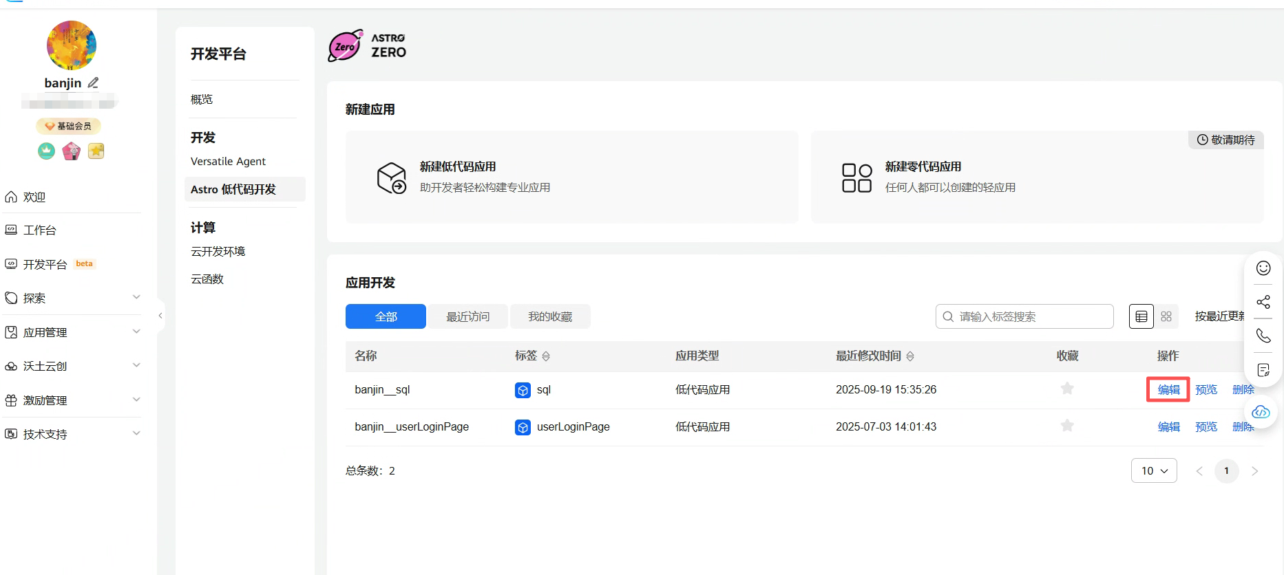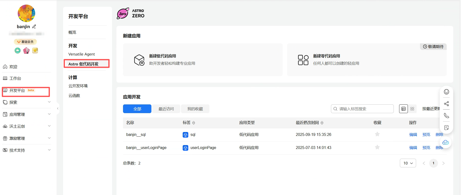 登录华为开发者空间,在左侧菜单列表选择华为开发者空间 -> 开发平台 -> Astro 低代码开发,进入华为开发者空间-低代码应用开发平台。