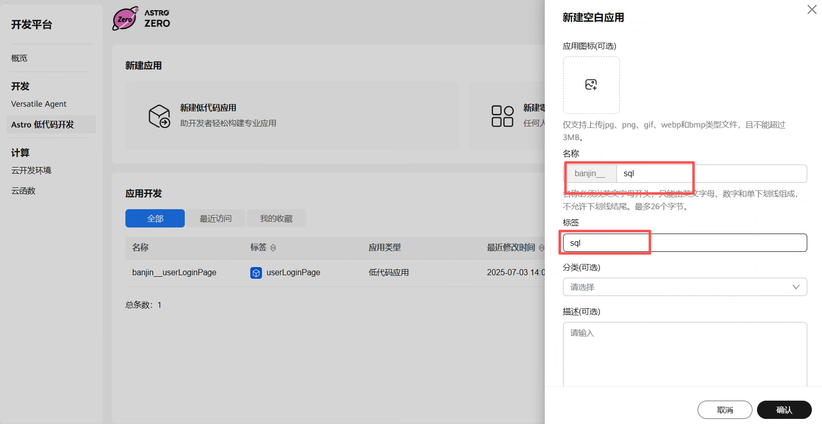 注:在点击确认后,在Astro轻应用管理页会同时新增一条刚才创建的名称为Astro_Test__sql的应用,点击编辑同样可以进入Astro轻应用服务控制台。