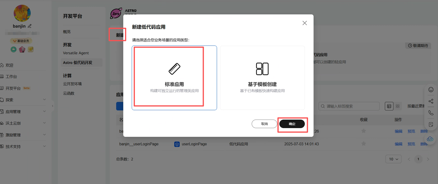 1、华为开发者空间-低代码应用开发平台页面点击新建低代码应用,在弹出的新建低代码应用对话框中,选择标准应用,点击确定按钮。