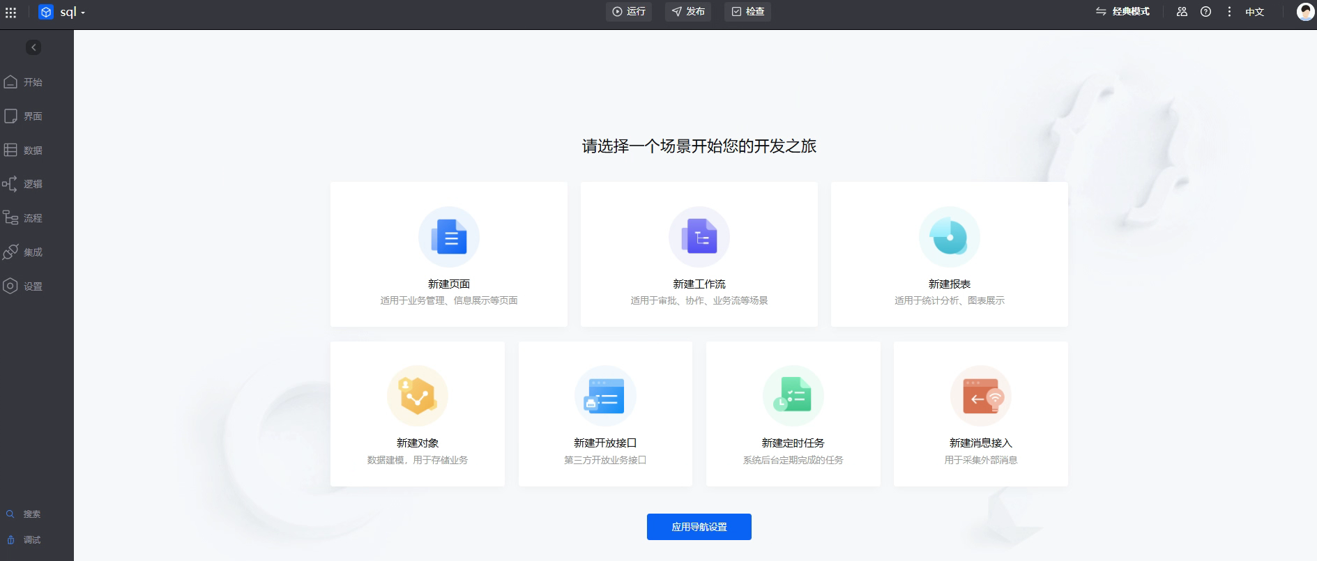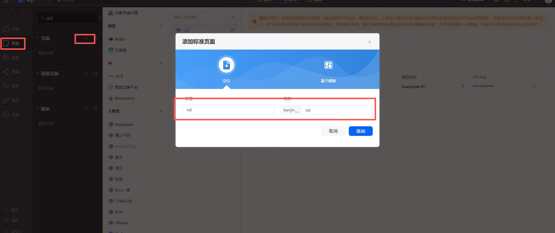 在新版应用设计器的“界面”中,单击页面后的添加图标,设置页面标签为“sql”、名称为“sql”,单击“添加”,即可创建一个标准页面: