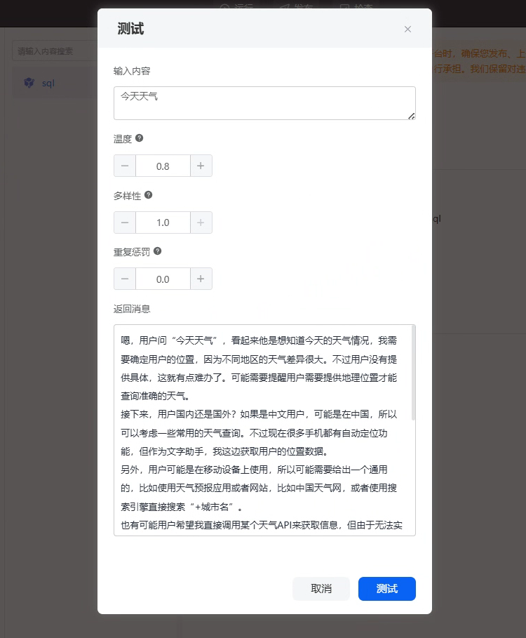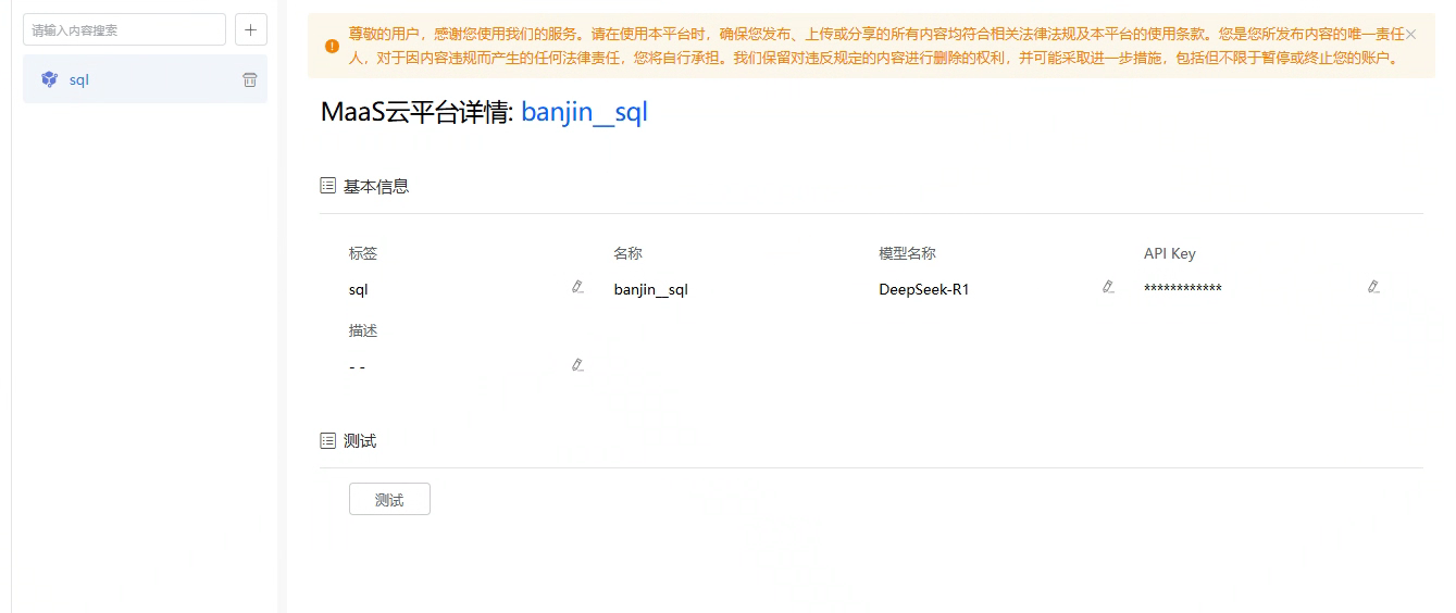 测试连通性,点击“测试”,在弹出框中输入测试内容后,点击测试等待返回结果,正常返回说明添加成功: